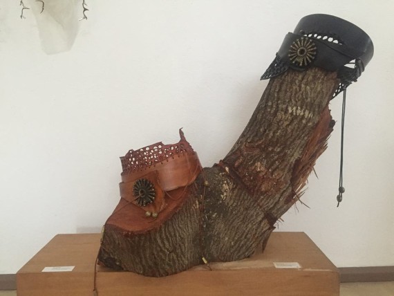 Comprising belts, necklaces, bangles, purses and bags among other wearable items, she sometimes adorns them with glass, animal horns and bronze works, while other pieces, which are cut in various shapes, hang alongside paintings and mirrors.
