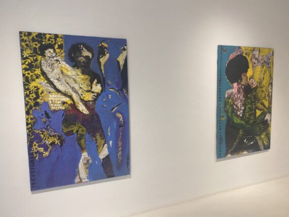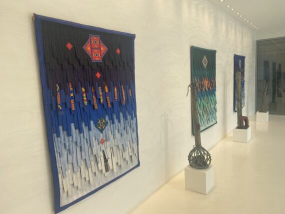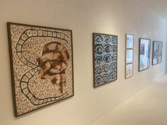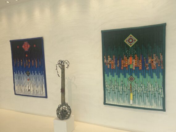 A dramatic blend of mixed media presentation where textiles, sculptures, oil paintings and watercolors meet and shine – the works are juxtaposed to one another thereby leaving them in an open dialogue.