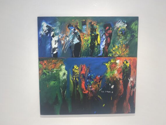 Also known as a sculptor, his works are characterized by spontaneous painterly movements, textured accents and neo-expressionistic techniques. Indeed, distorted human figures turn into humanlike shadows alongside abstract lines and bold brush strokes.