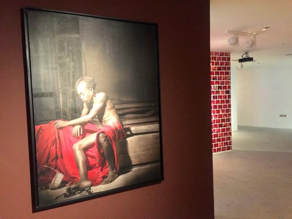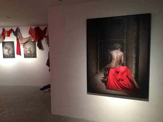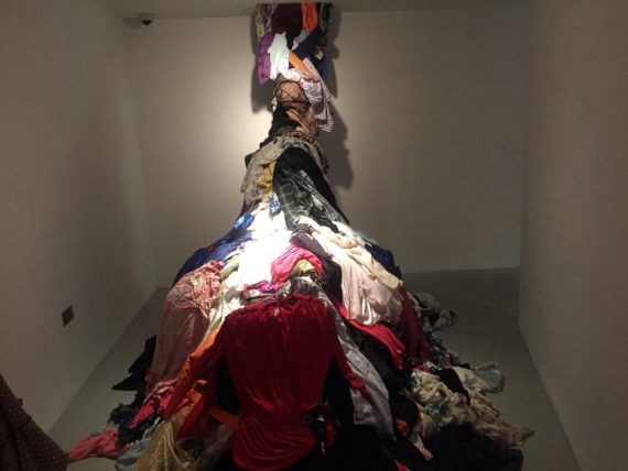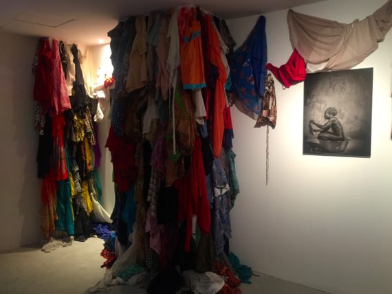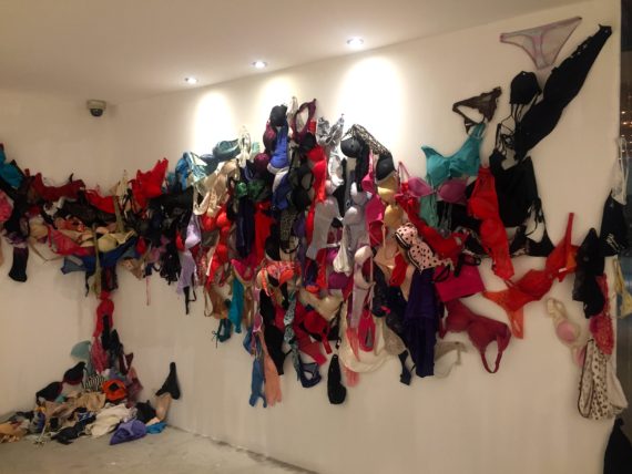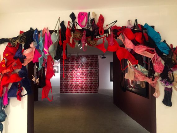 Also on display in the form of a brick wall, are “millions” of photos of previous ritualistic performances from his personal studio and pictures of other installations of female costumes and underwear, which he has worn and collected since 2013.