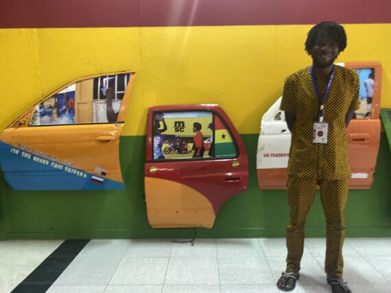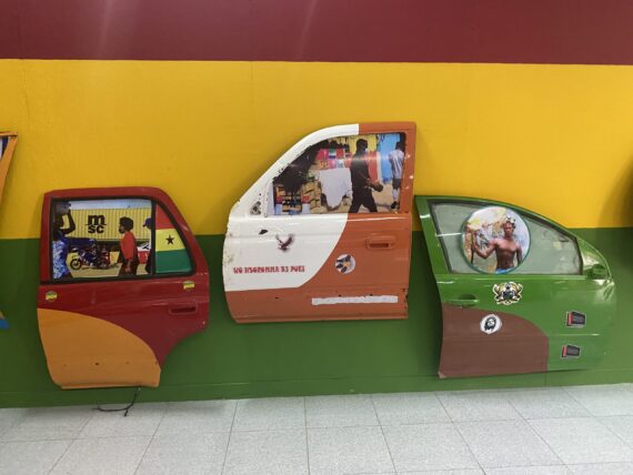 Installations of brightly painted car doors by Darko comment on how people engage in public urban spaces in Ghana. The doors, which are in multiple colours are set against walls painted in the colours of the Ghanaian flag.